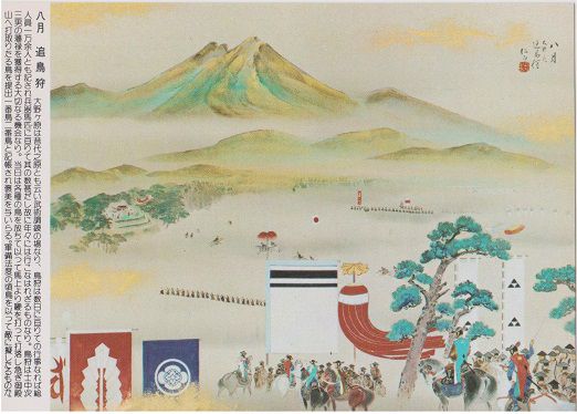 八月 追鳥狩 大野ヶ原は昔代之原とも云い武術調錬の場なり、鳥狩は数日に亘りての行事なれば総人員一万余人とも記され兵器馬匹に亘りて其の数甚だし故に年々には行こなはれざるものなり。鳥狩は士中次三男の藩禄を獲得する大切なる機会なり。当日は各種の鳥を放ちて以って馬上より鞭を打って打落し急ぎ御殿山へ打取りたる鳥を提出一番鳥二番鳥と記帳され褒美を与いらる。軍備法度の頃鳥を以って敵に擬したるものか。